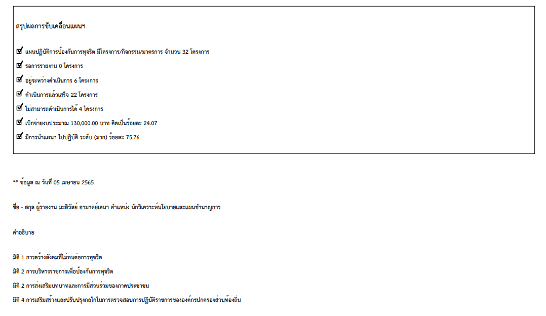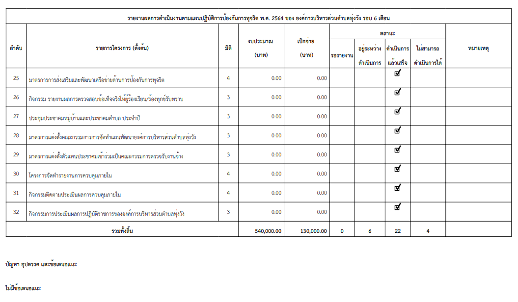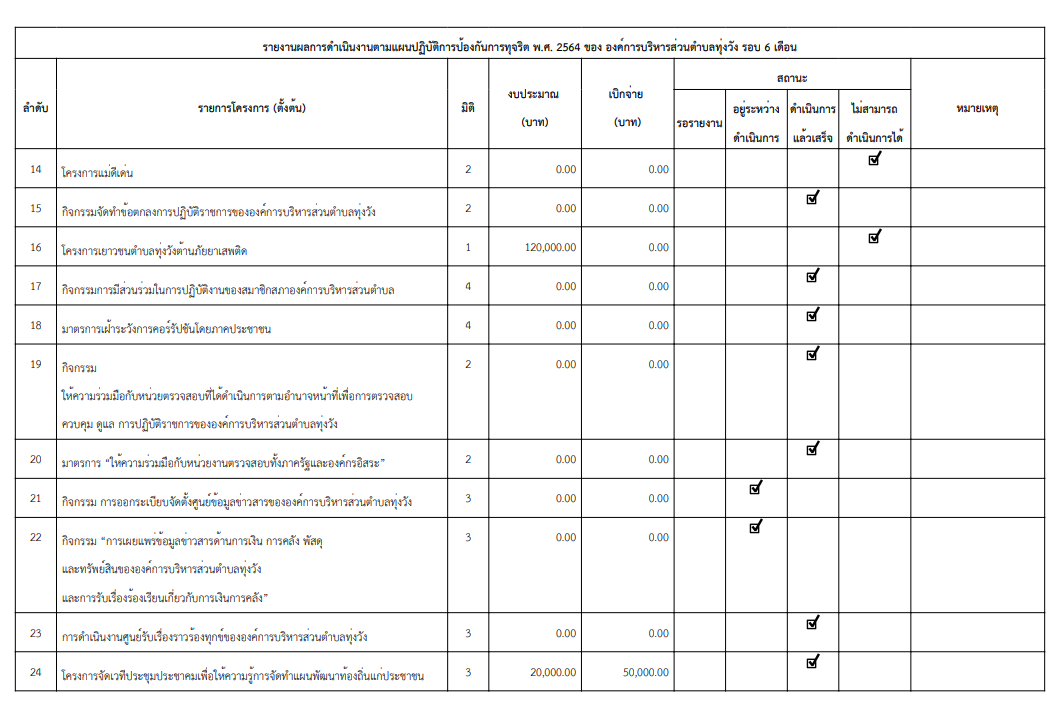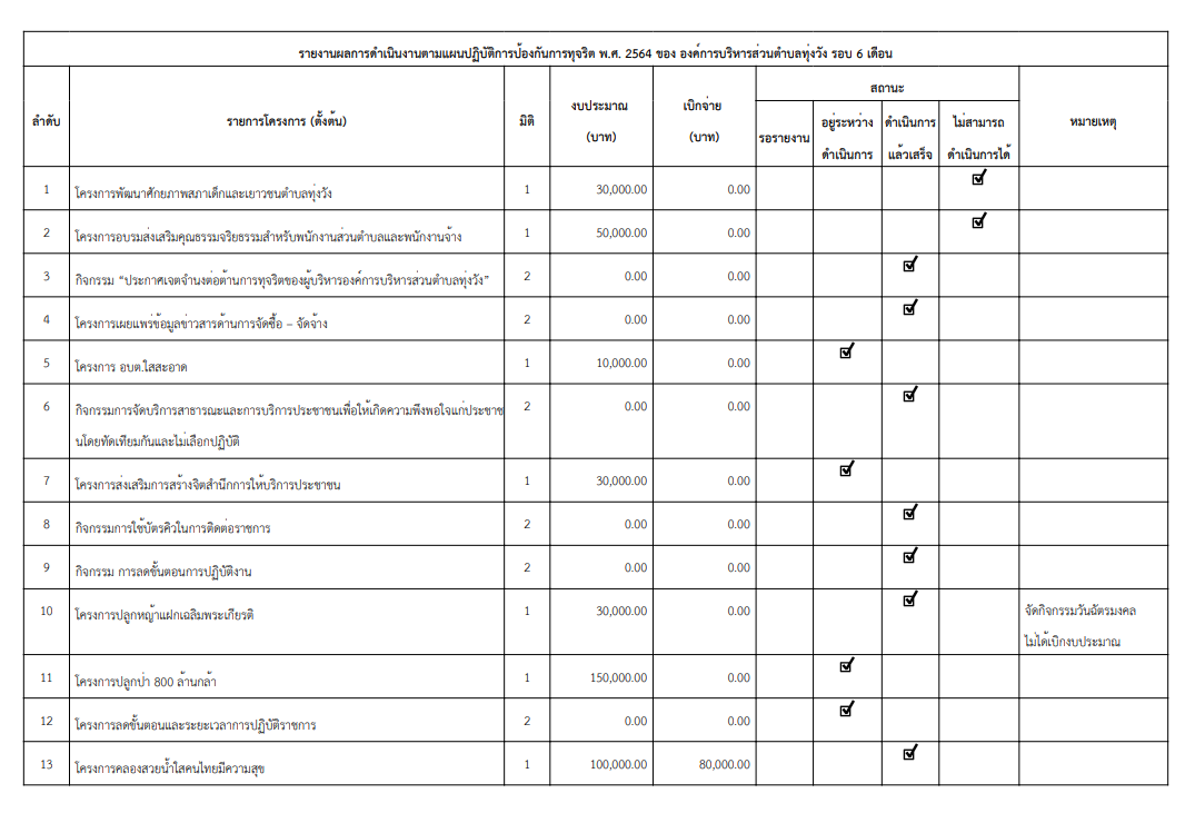 รายงานผลการดำเนินงานตามแผนปฏิบัติการป้องกันการทุจริต 2564 รอบ 6 เดือน
