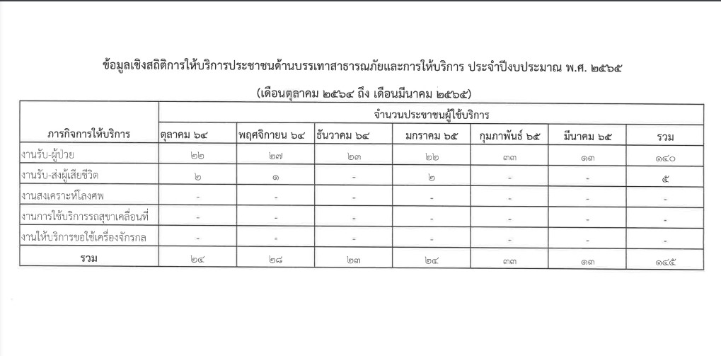 ข้อมูลเชิงสถิติการให้บริการประชาชนด้านบรรเทาสาธารณภัยและการให้บริการประจำปี พ.ศ.2565(เดือนตุลาคม2565ถึงเดือนมีนาคม2565)
