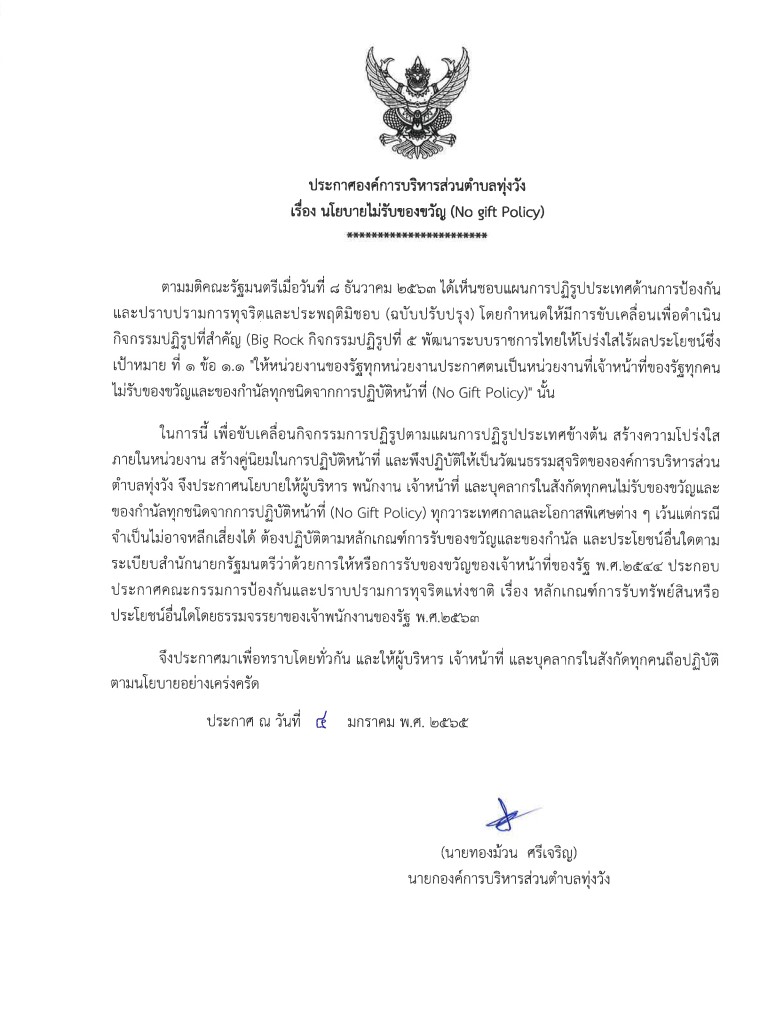 ประกาศเจตนารมณ์ นโยบายการไม่รับของขวัญและของกำนัลทุกชนิดจากการปฏิบัติหน้าที่(NO Gift PolicY) พ.ศ.2569