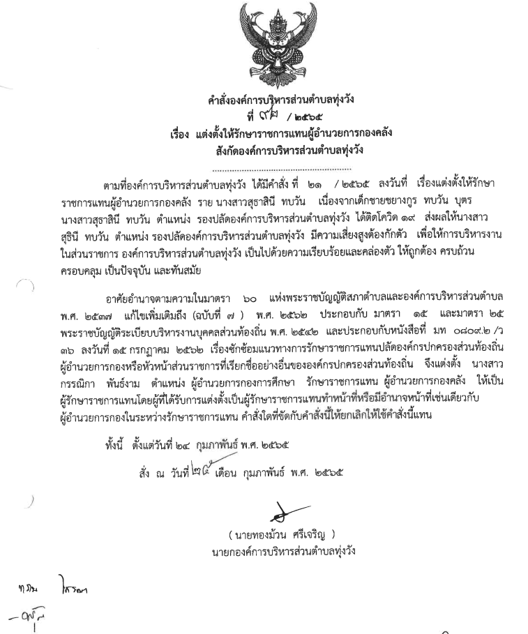 แต่งตั้งให้รักษาราชการแทนผู้อำนวยการกองคลังสังกัดการบริหารส่วนตำบลทุ่งวัง