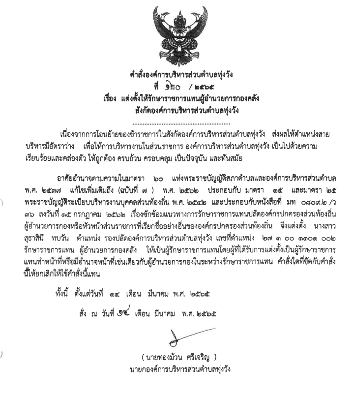 คำสั่ง แต่งตั้งให้รักษาราชการแทนผู้อำนวยการกองคลัง สังกัดองค์การบริหารส่วนตำบลทุ่งวัง