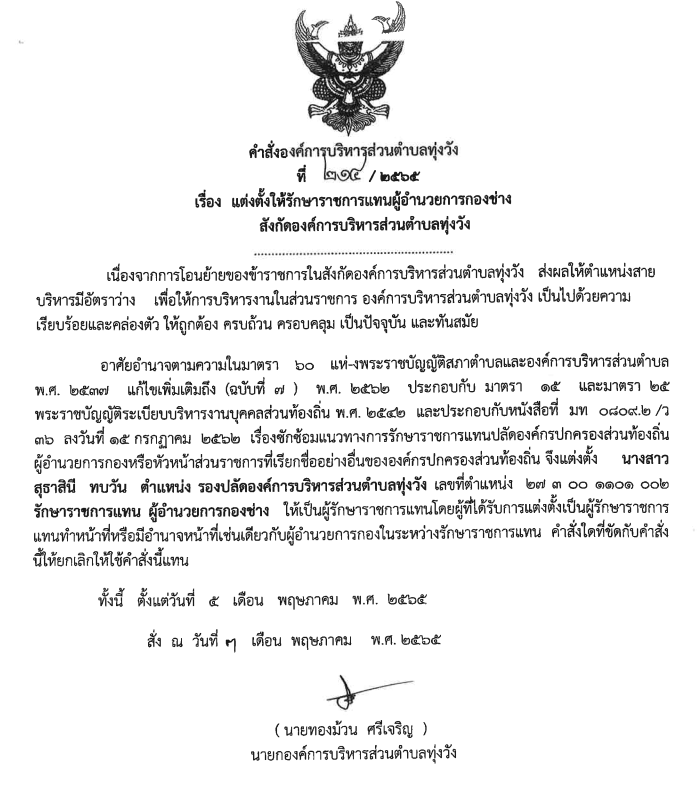 คำสั่ง แต่งตั้งให้รักษาราชการแทนผู้อำนวยการกองช่าง สังกัดองค์การบริหารส่วนตำบลทุ่งวัง