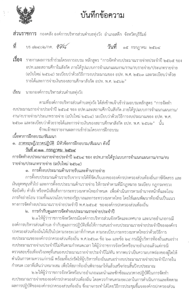 รายงานผลการเข้าร่วม หลักสูตร การจัดทำงบประมาณรายจ่ายประจำปี 2564 ของ อปท.และสถานศึกษาในสังกัด