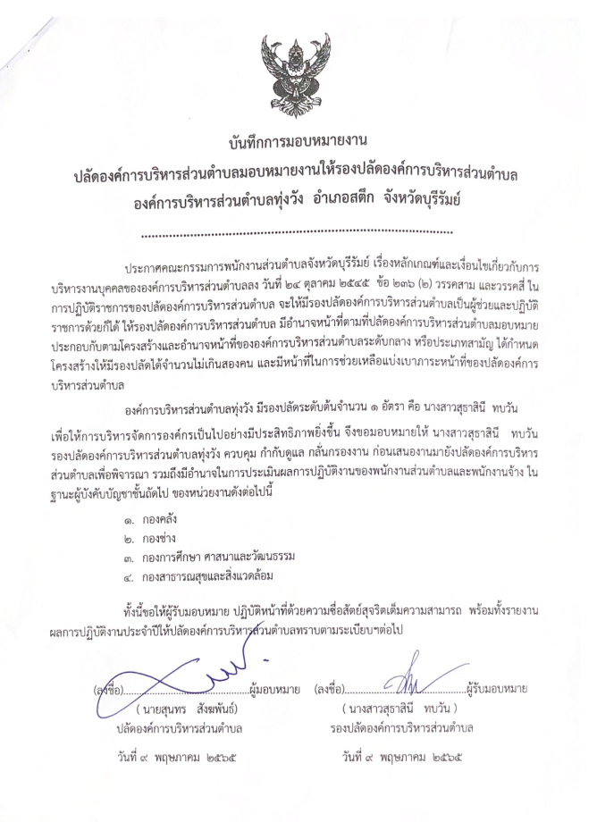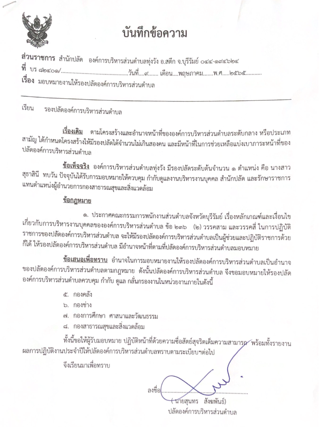 บันทึกการมอบหมายงาน ปลัดองค์การบริหารส่วนตำบล