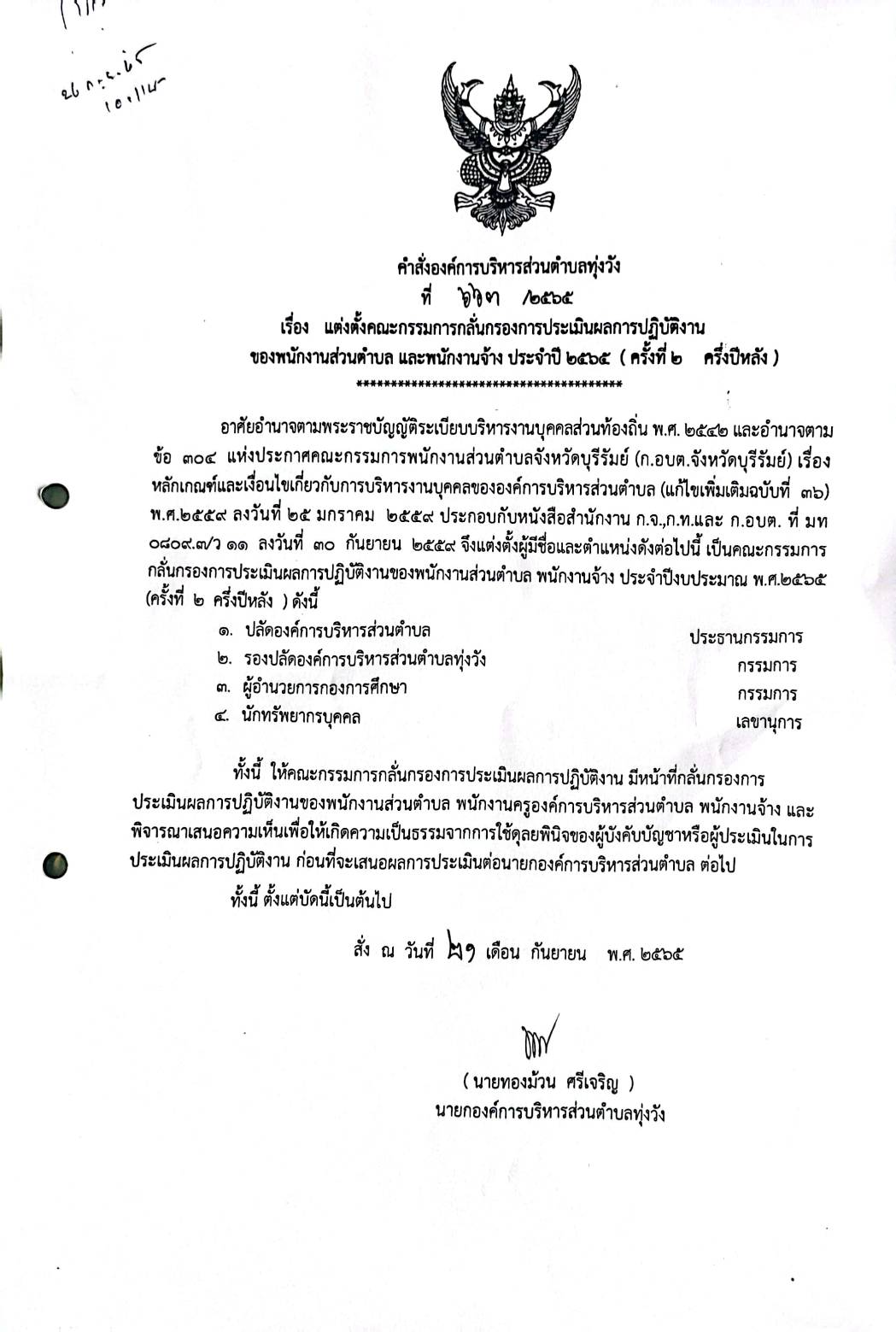 แต่งตั้งคณะกรรมการกลั่นกรองการประเมินผลการปฏิบัติงานของพนักงานส่วนตำบล และพนักงานจ้าง ประจำปี 2565 (ครั้งที่ 2 ครึ่งปีหลัง)