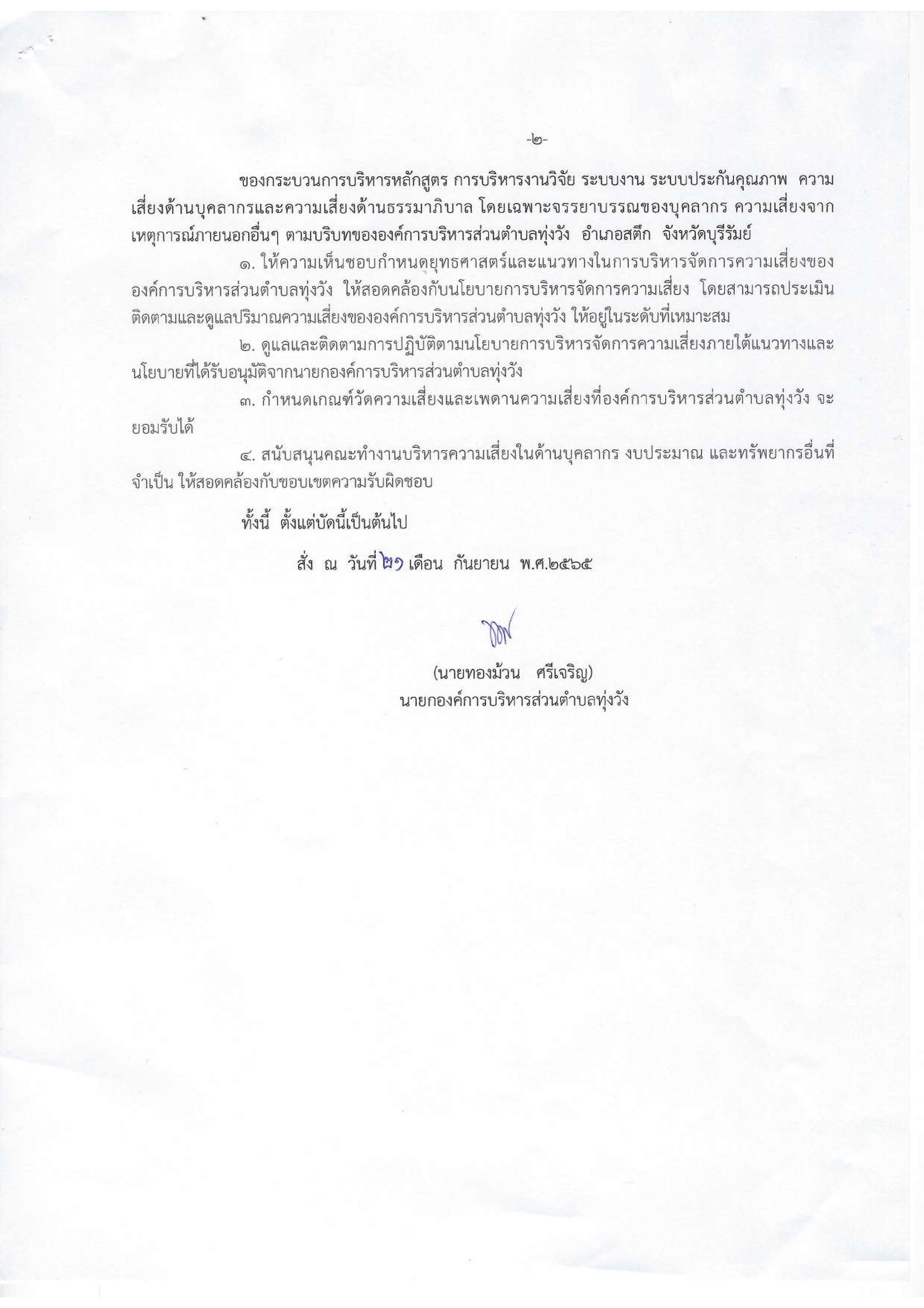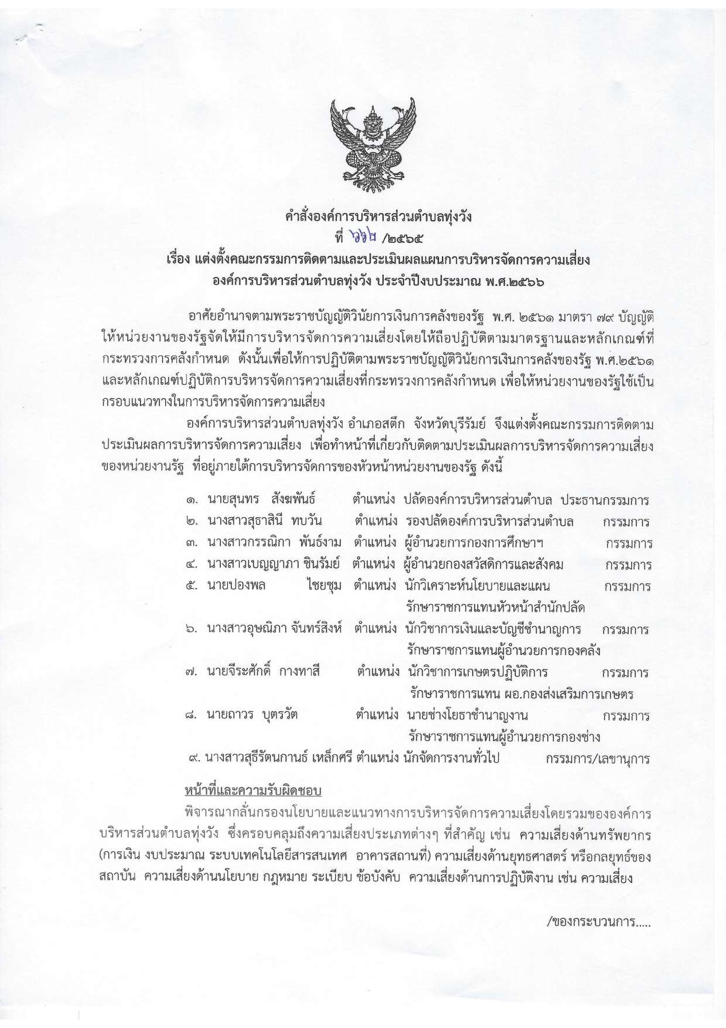 แต่งตั้งคณะกรรมการติดตามและประเมินผลแผนการบริหารจัดการความเสี่ยง องค์การบริหารส่วนตำบลทุ่งวัง ประจำปีงบประมาณ พ.ศ. 2566