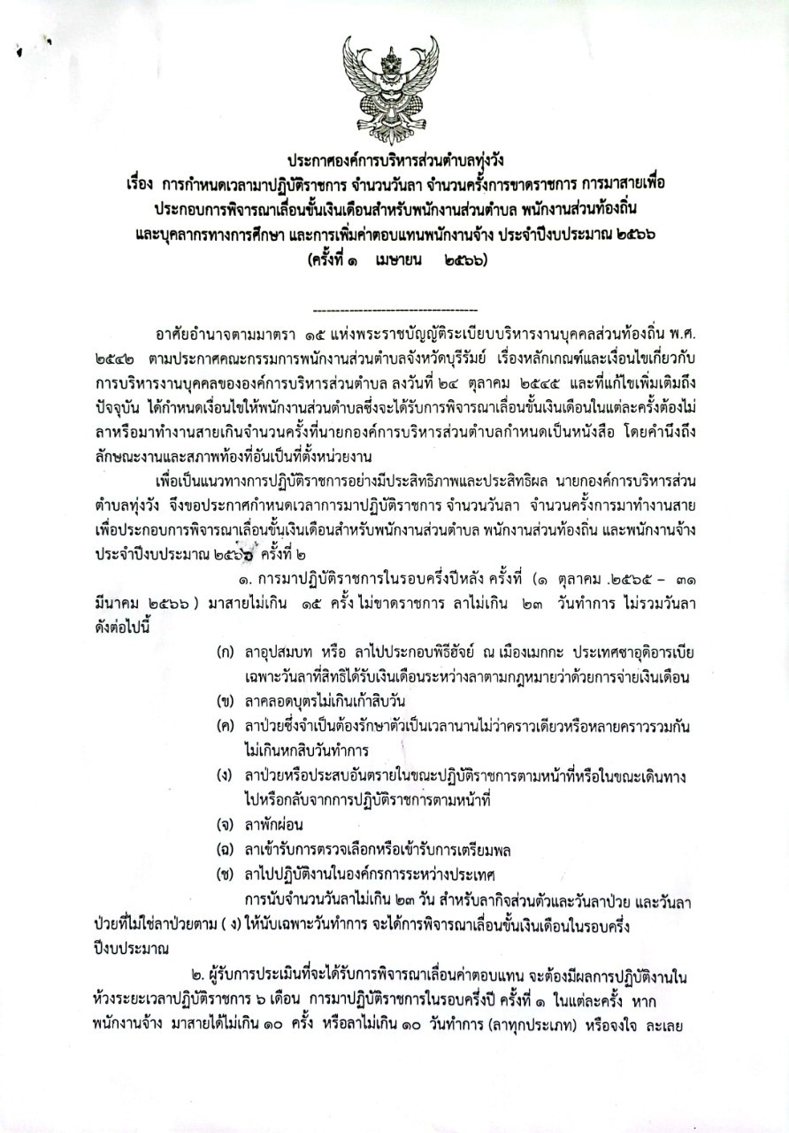 การกำหนดเวลามาปฏิบัติราชการ จำนวนวันลา จำนวนครั้งการขาดราชการ การมาสายเพื่อประกอบการพิจารณาเลื่อนขั้นเงินเดือนสำหรับพนกงานส่วนตำบล พนักงานส่วนท้องถิ่น และบุคลากรทางการศึกษา และการเพิ่มค่าตอบแทนพนักงานจ้าง ประจำปีงบประมาณ 2566