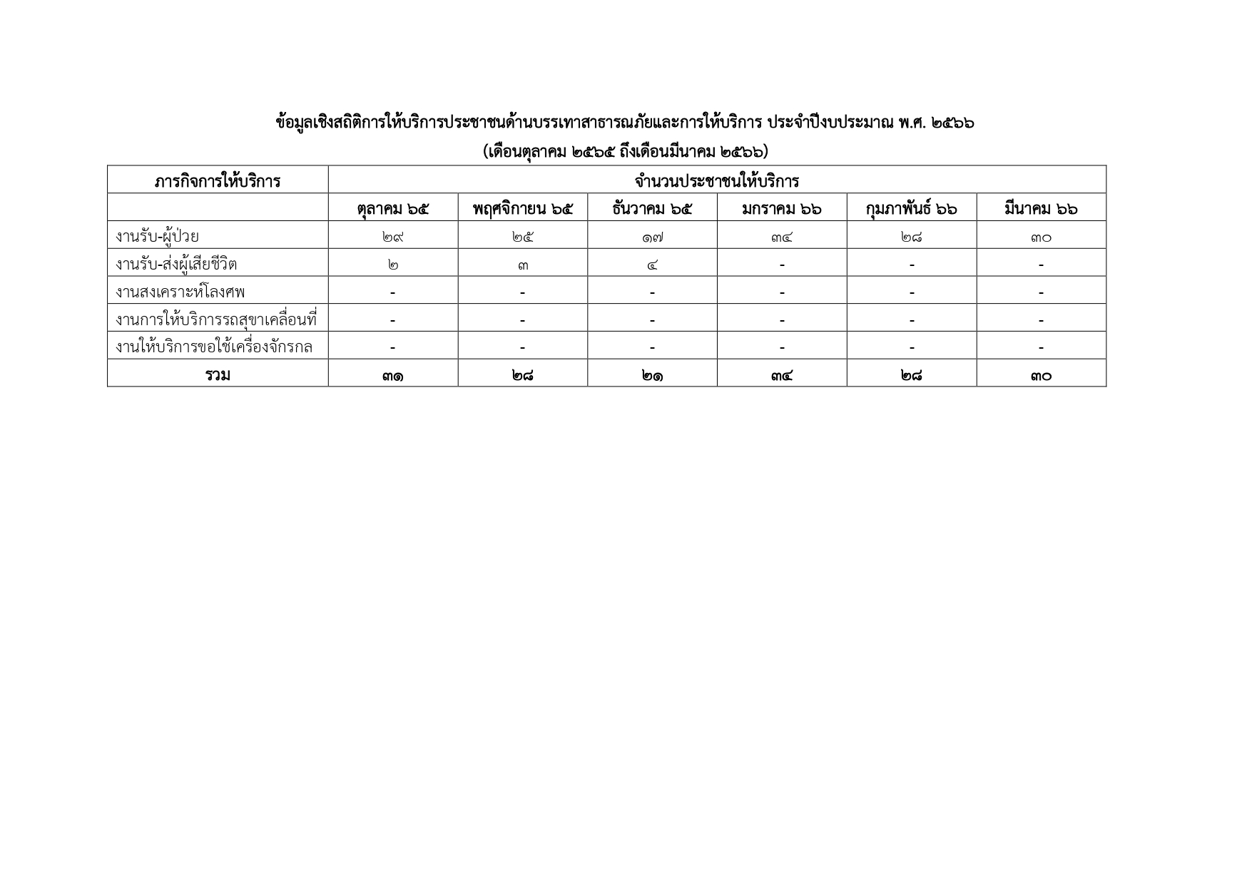 ข้อมูลสถิติการให้บริการประชาชนด้านบรรเทาสาธาณถัยและการให้บริการประจำปี เดือนตุลาคม 2565 - มีนาคม 2566