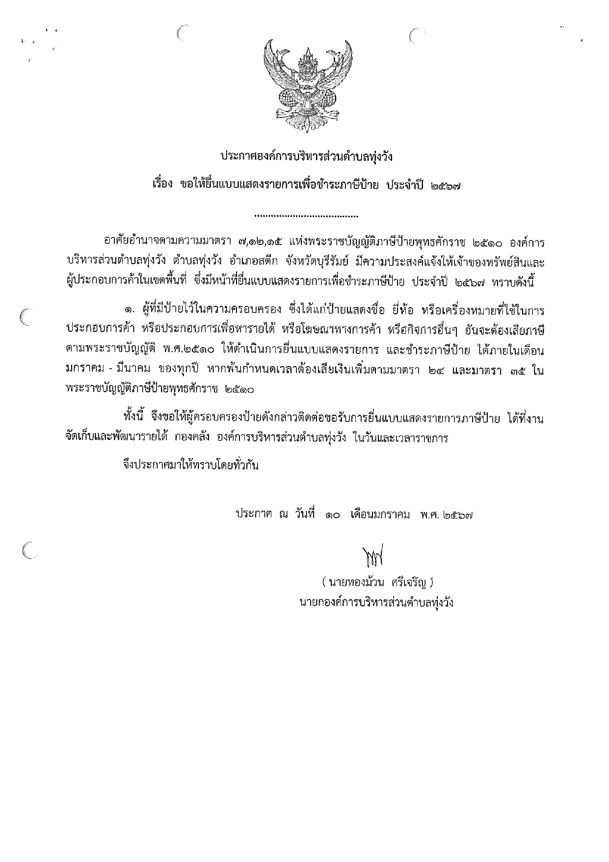 ประกาศ ขอให้ยื่นแบบแสดงรายการเพื่อชำระป้ายภาษี ประจำปี 2567