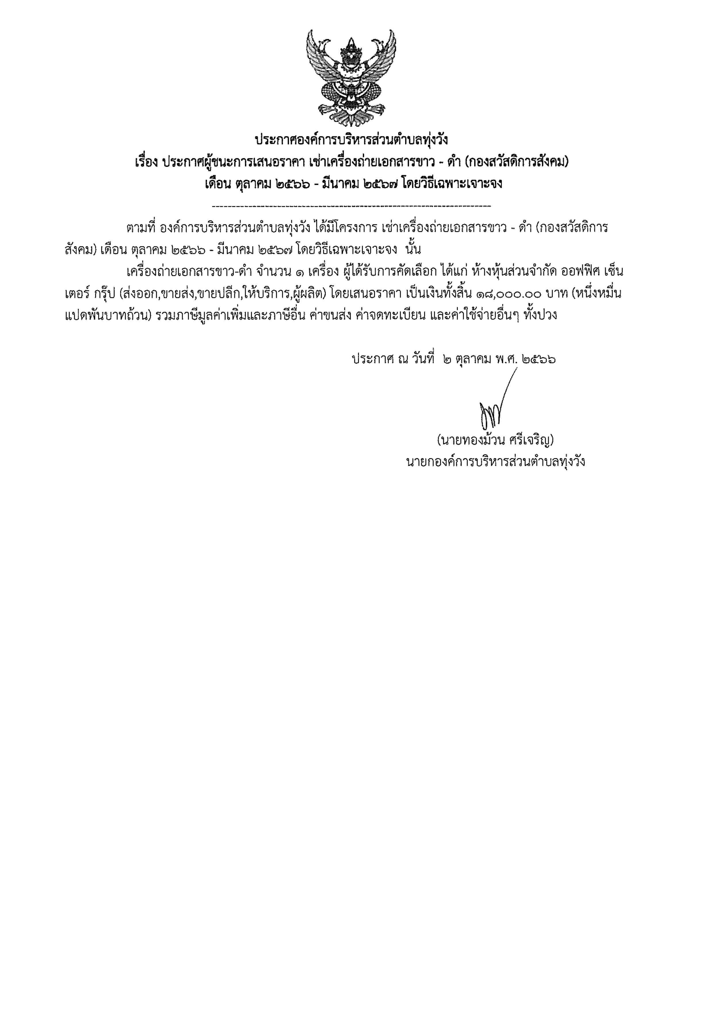 ประกาศผู้ชนะการเสนอราคา เช่าเครื่องถ่ายเอกสารขาว-ดำ (กองสวัสดิการ)