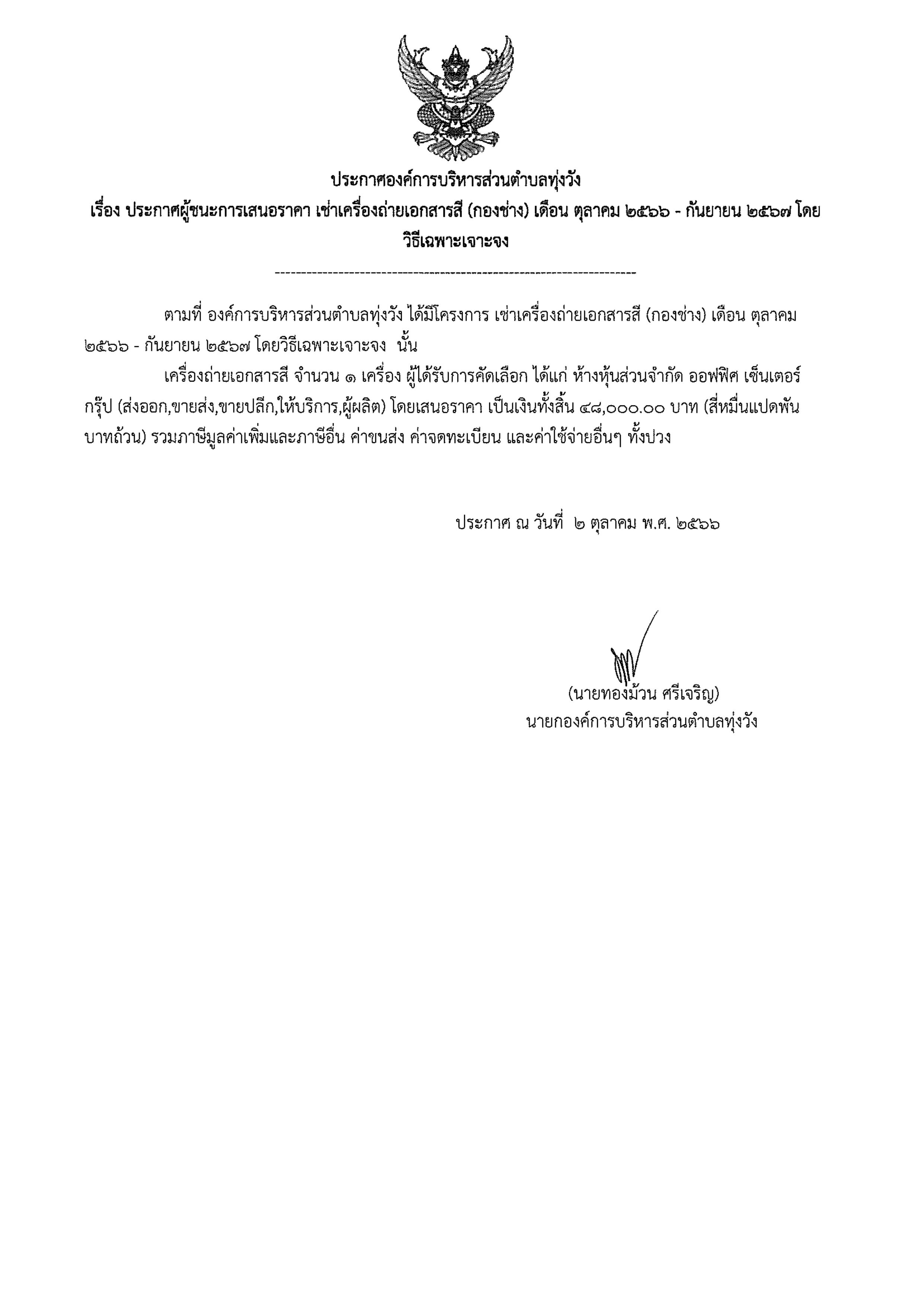 ประกาศผู้ชนะการเสนอราคา เช่าเครื่องถ่ายเอกสารสี (กองช่าง)