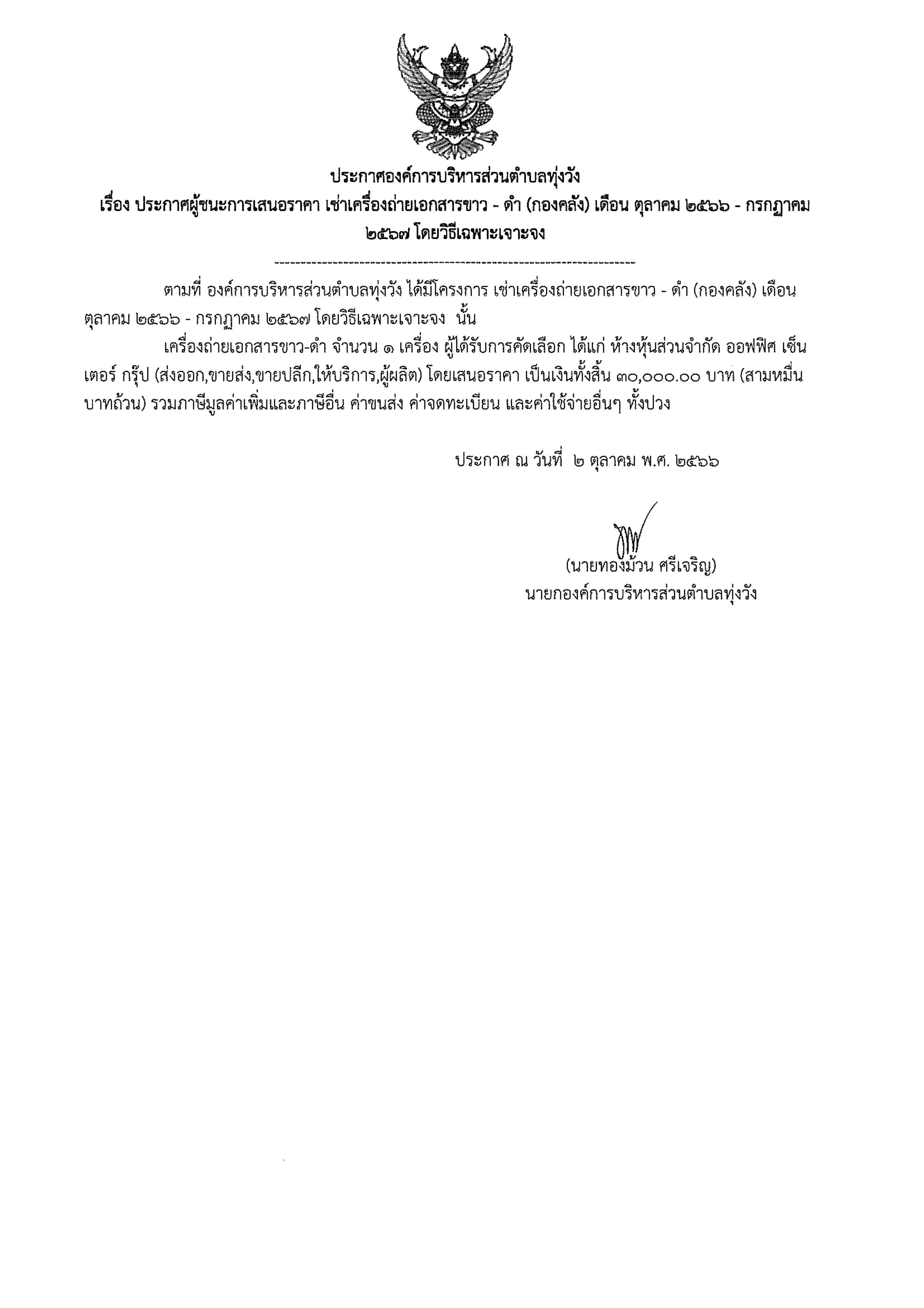 ประกาศผู้ชนะการเสนอราคา เช่าเครื่องถ่ายเอกสารขาว-ดำ (กองคลัง)