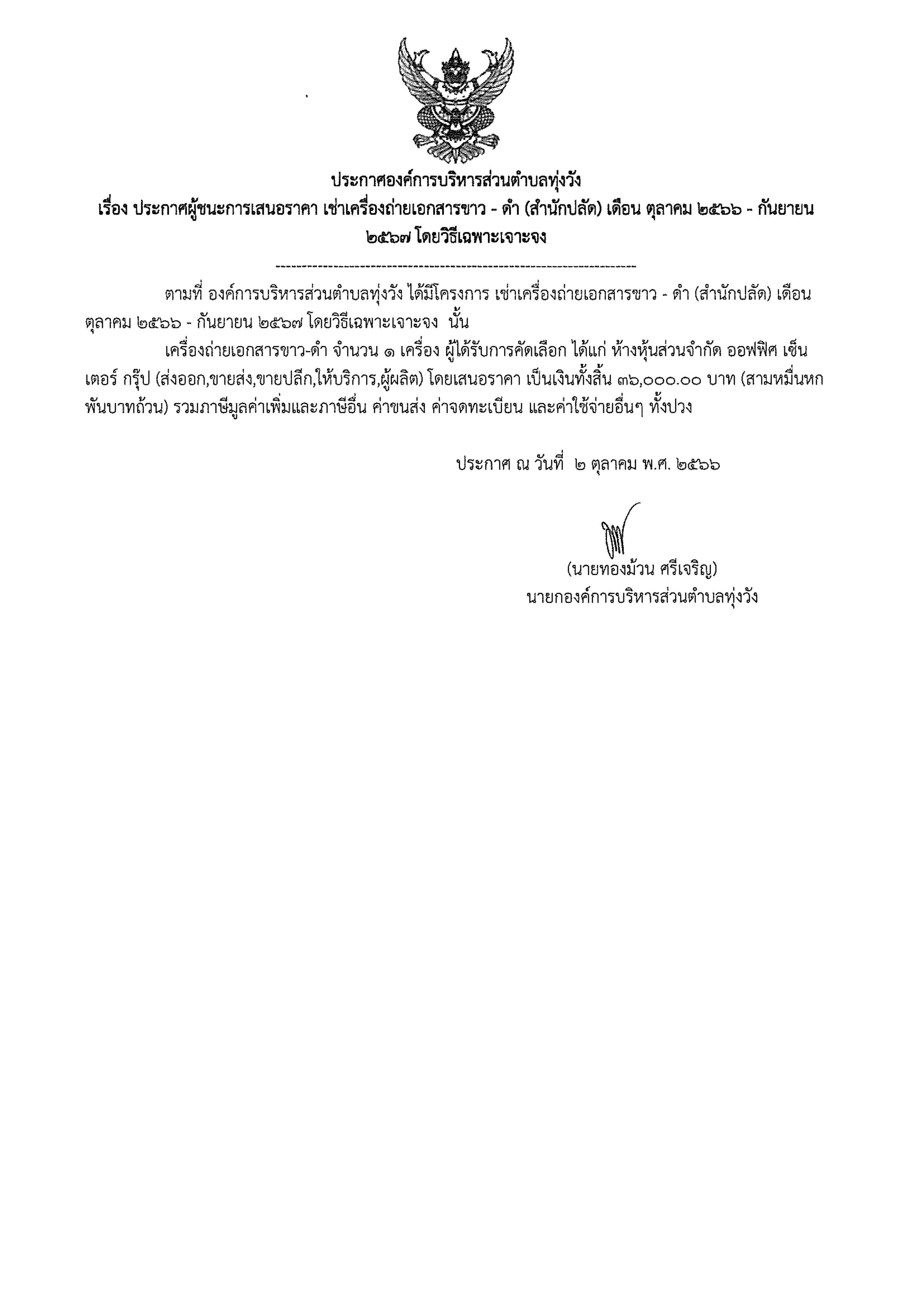 ประกาศผู้ชนะการเสนอราคา เช่าเครื่องถ่ายเอกสารขาว-ดำ (สำนักปลัด)