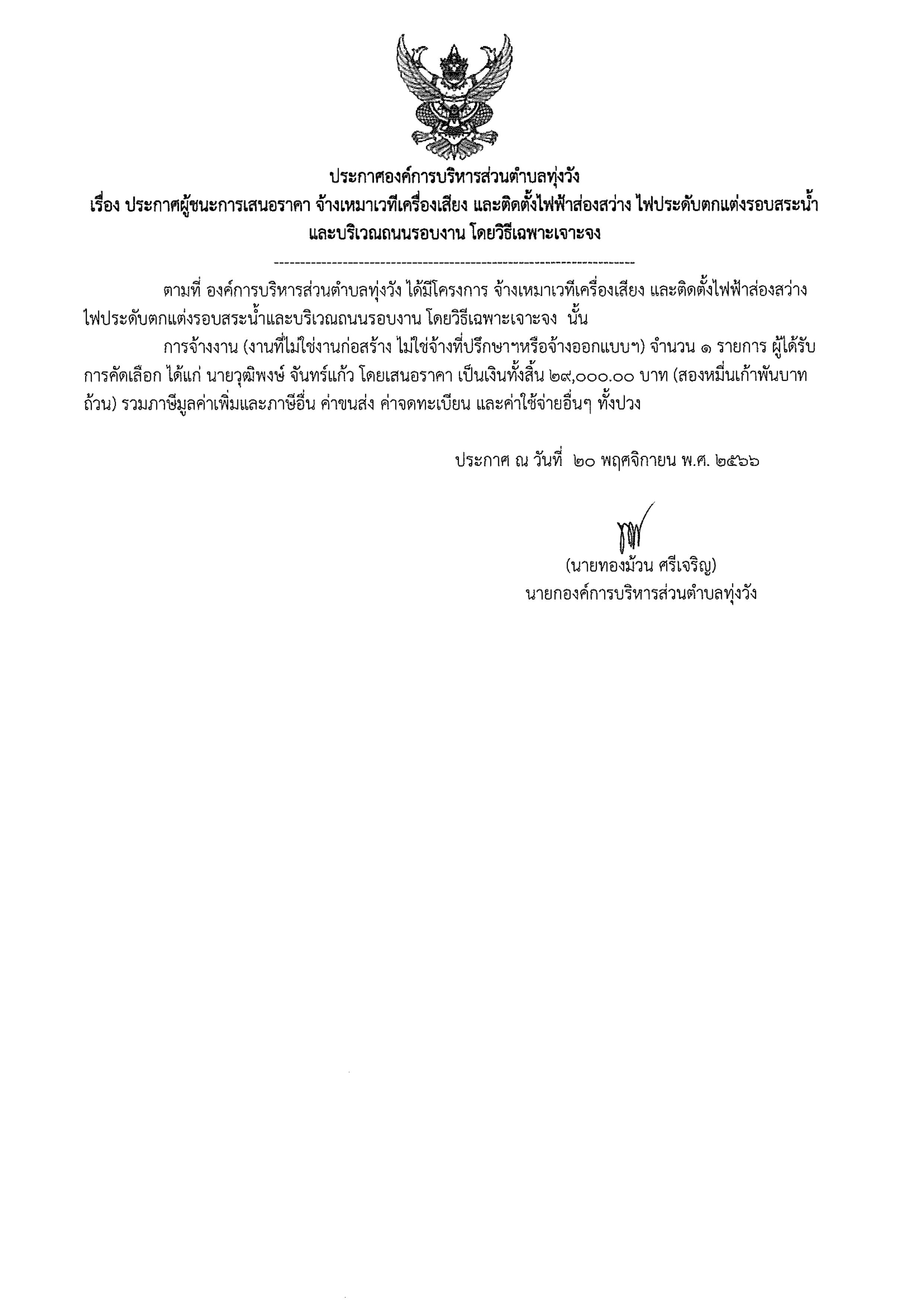 ประกาศผู้ชนะการเสนอราคา จ้างเหมาเวทีเครื่องเสียง วันลอยกระทงฯ
