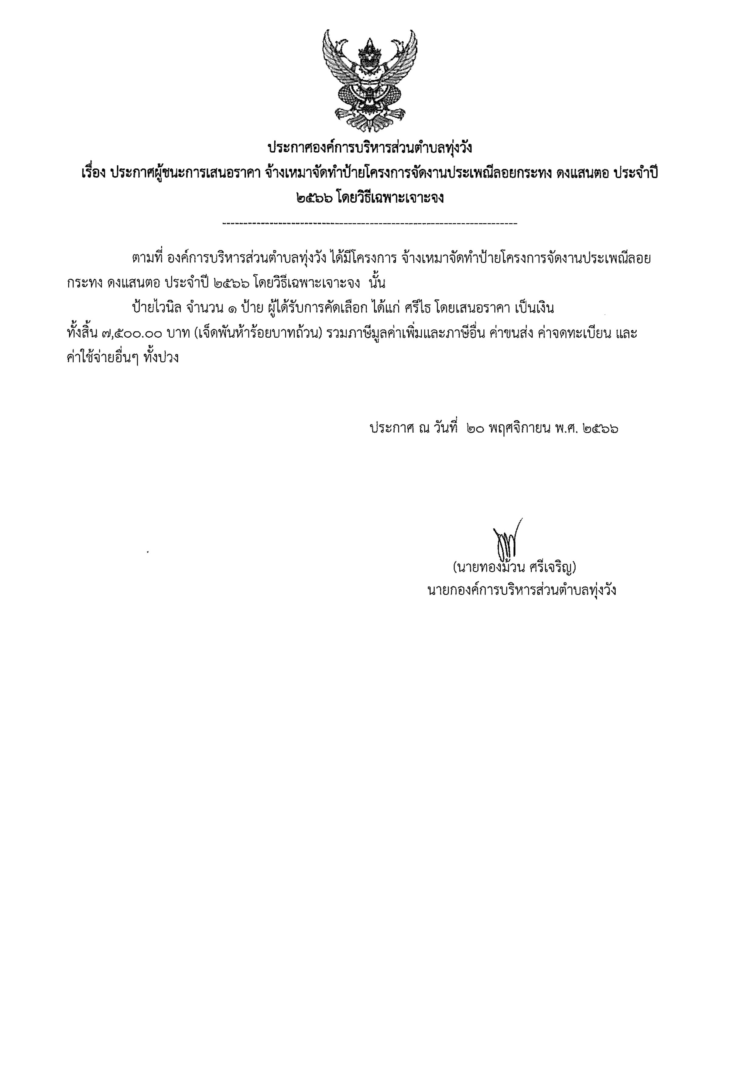 ประกาศผู้ชนะการเสนอราคา จ้างเหมาจัดทำป้ายโครงการ วันลอยกระทงฯ