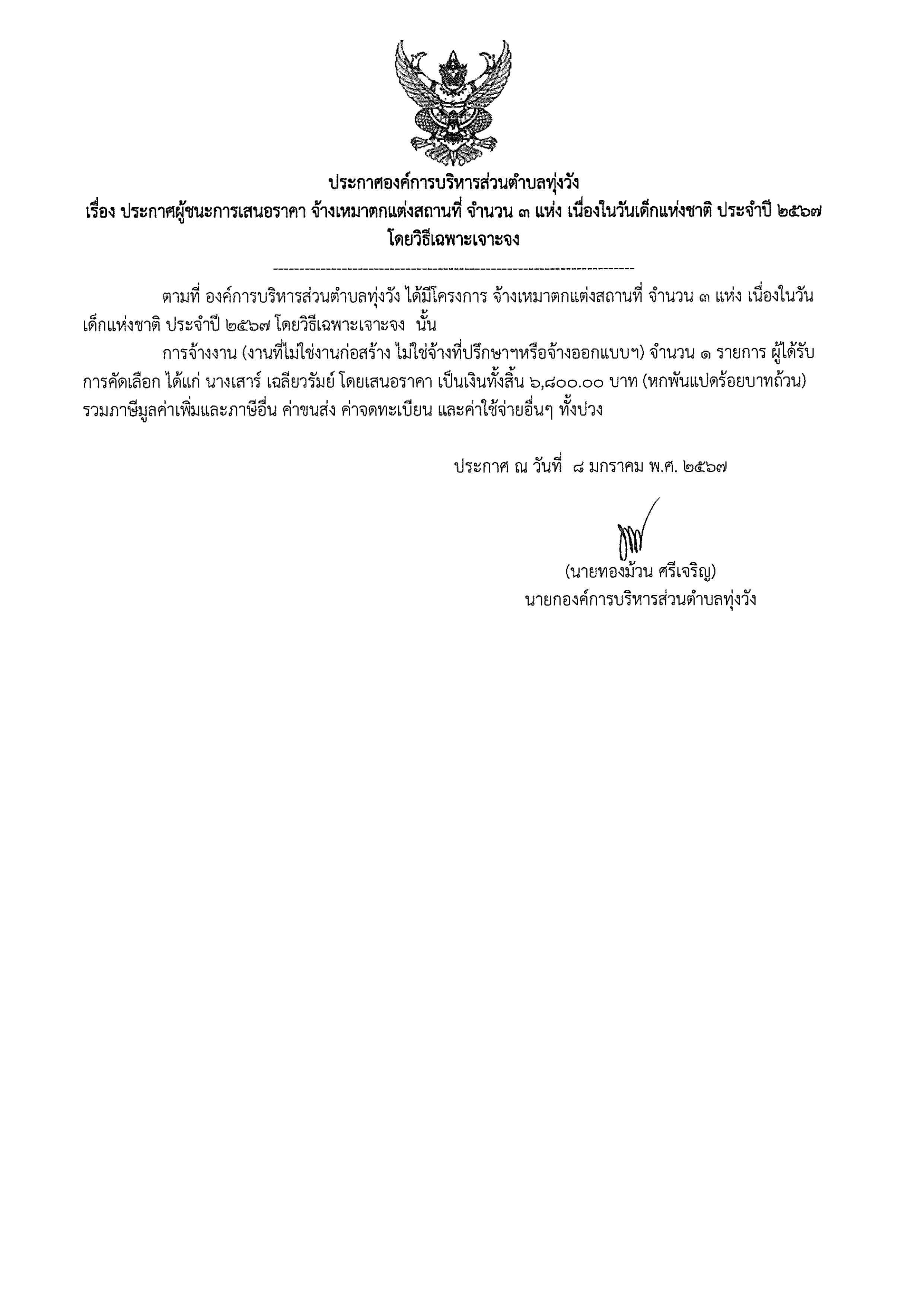 ประกาศผู้ชนะการเสนอราคา จ้างเหมาตกแต่งสถานที่ฯ วันเด็กแห่งชาติ ปี 2567