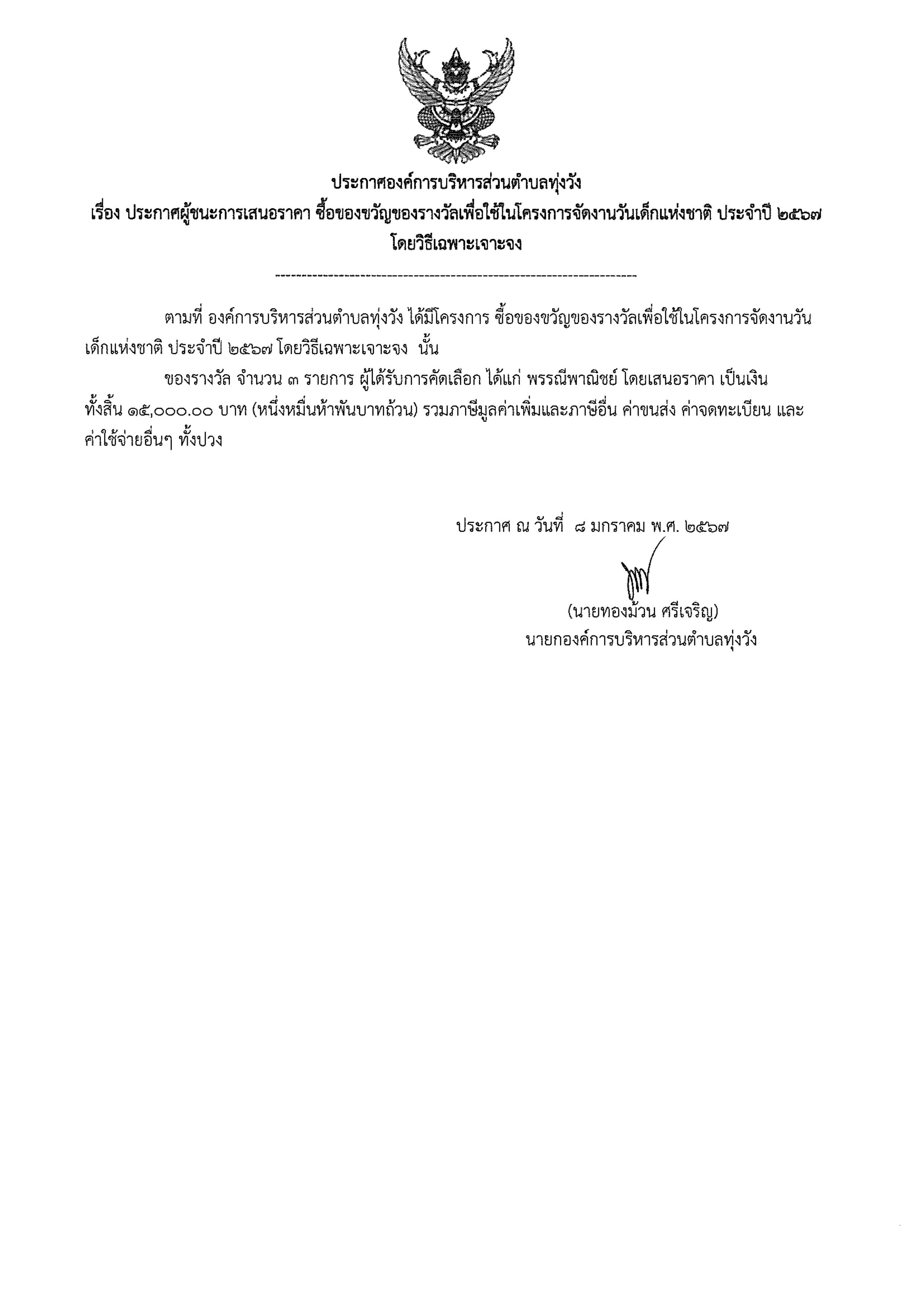 ประกาศผู้ชนะการเสนอราคา ซื้อของขวัญของรางวัลฯ วันเด็กแห่งชาติ ปี 2567