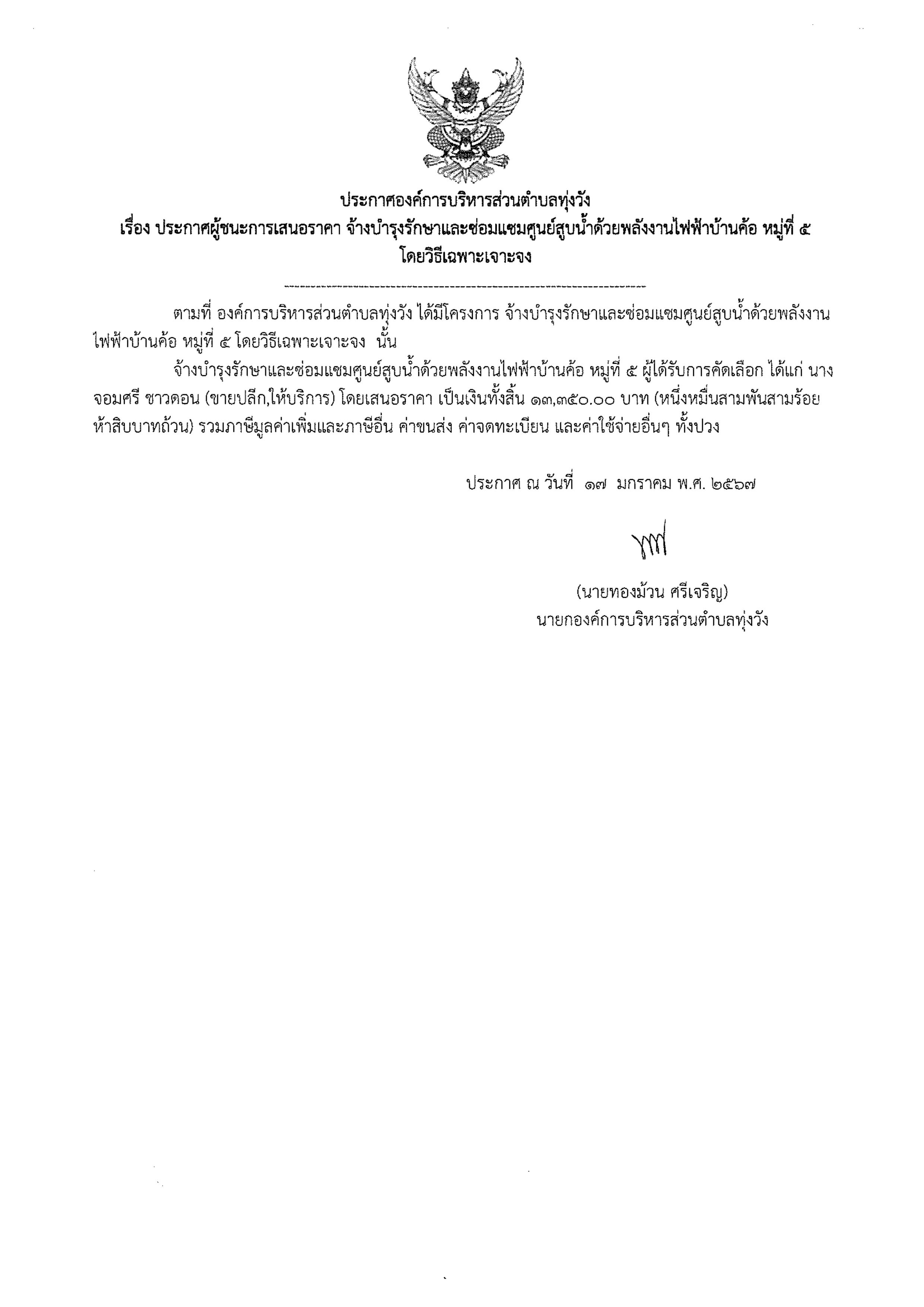 ประกาศผู้ชนะการเสนอราคา จ้างบำรุงรักษาและซ่อมแซมศูนย์สูบน้ำฯ หมู่ 5