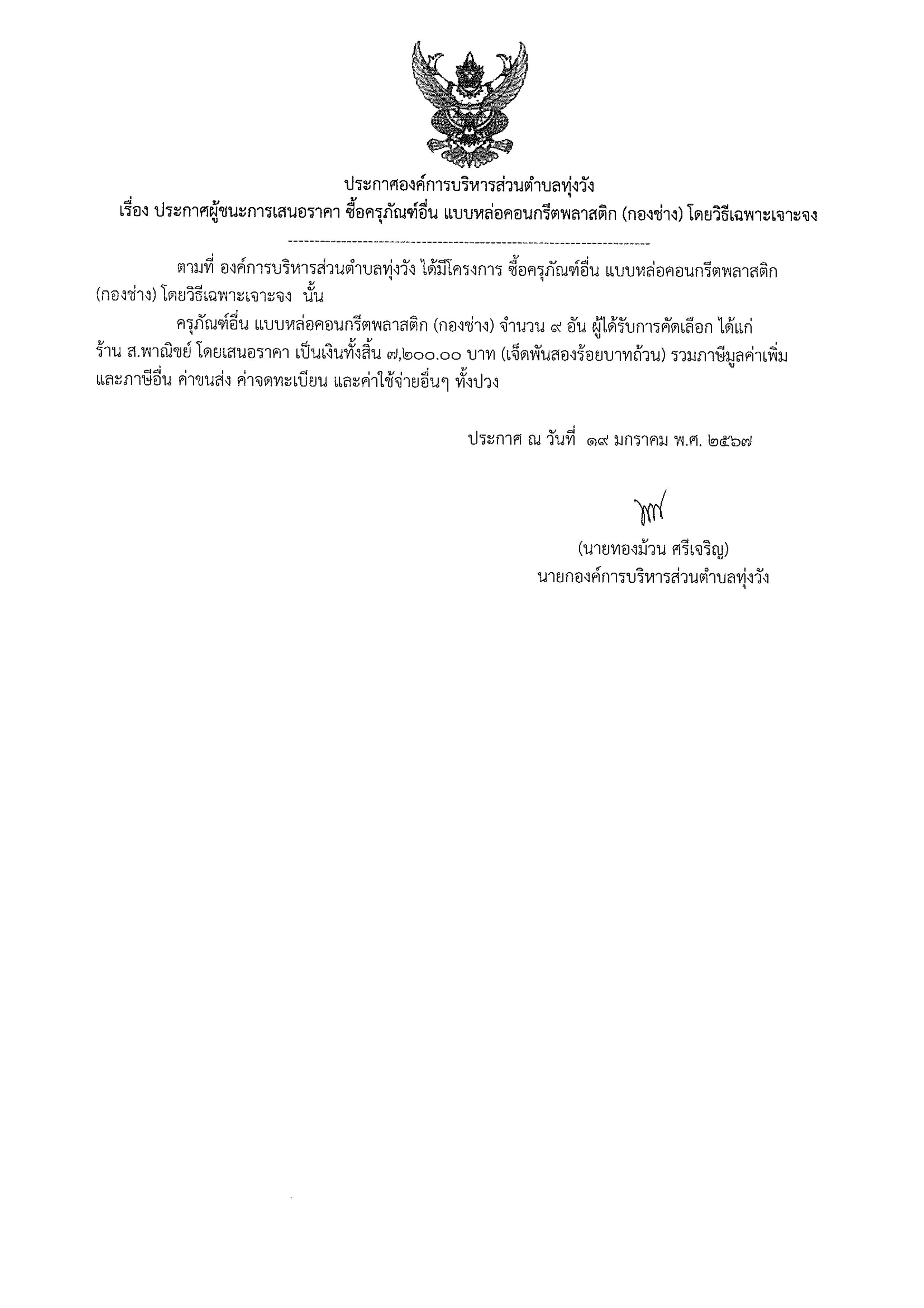 ประกาศผู้ชนะการเสนอราคา ซื้อครุภัณฑ์อื่น แบบหล่อคอนกรีตพลาสติก (กองช่าง)