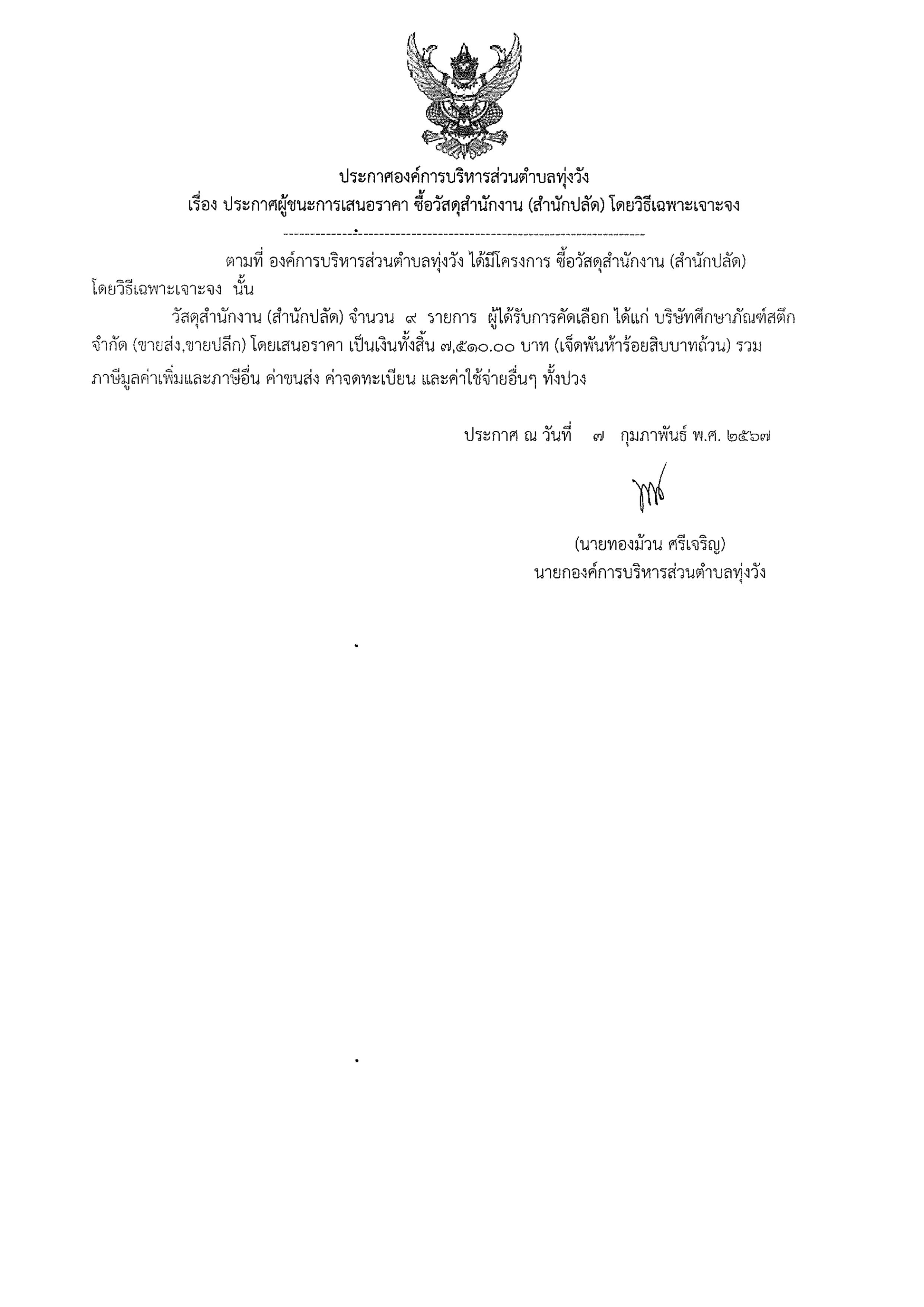 ประกาศผู้ชนะการเสนอราคา ซื้อวัสดุสำนักงาน (สำนักปลัด)