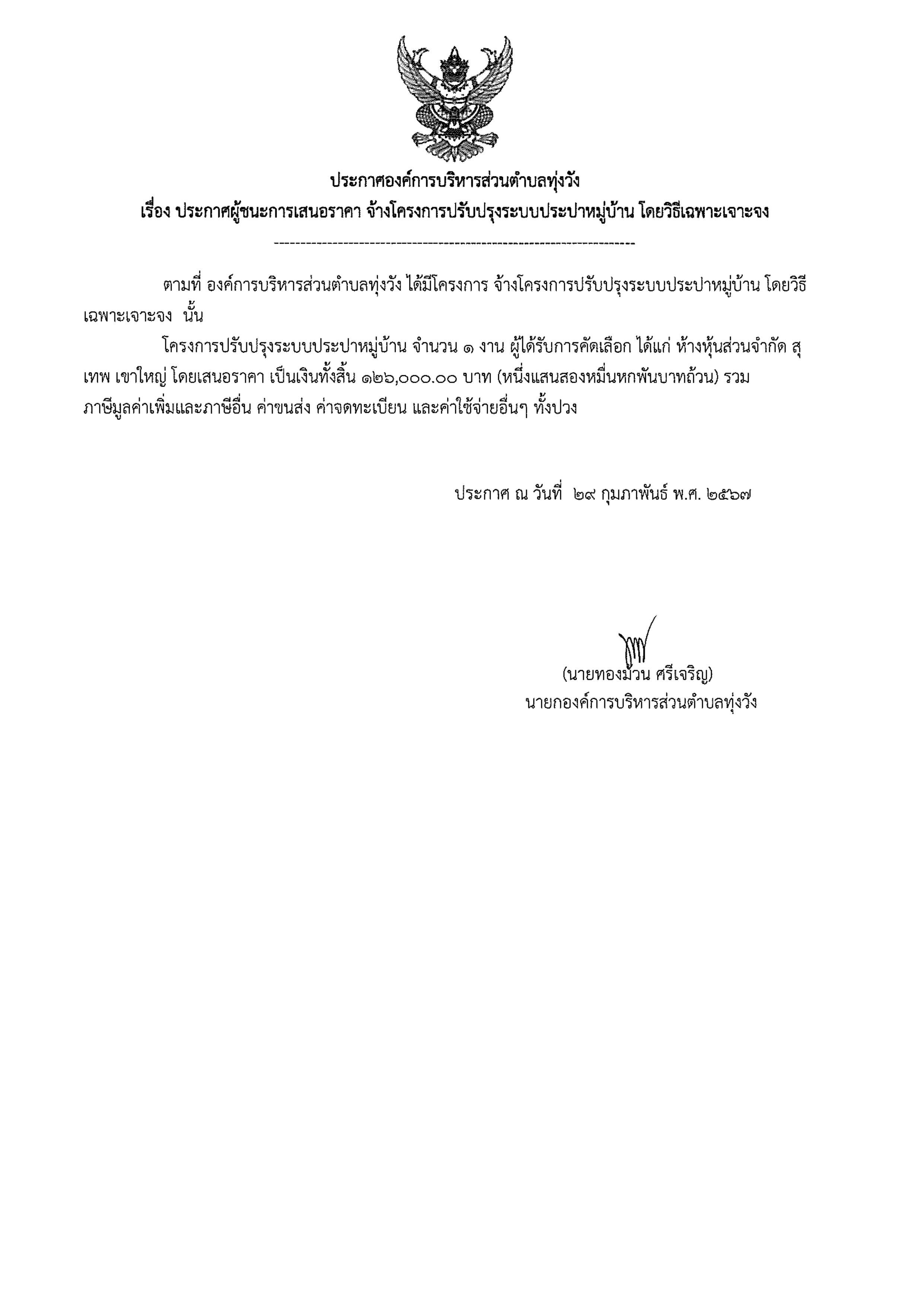 ประกาศผู้ชนะการเสนอราคา จ้างโครงการปรับปรุงระบบประปาหมู่บ้าน