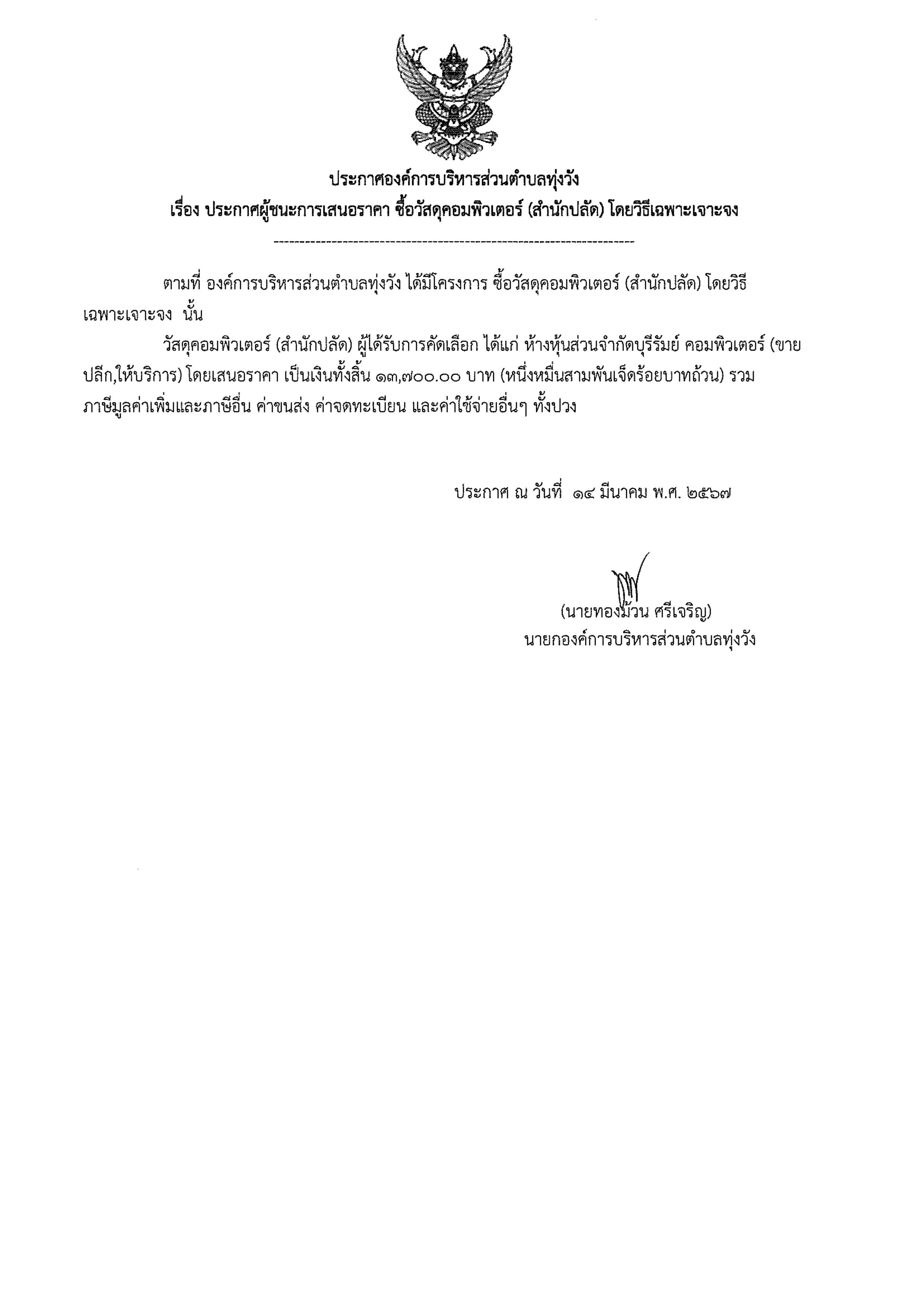 ประกาศผู้ชนะการเสนอราคา ซื้อวัสดุคอมพิวเตอร์ (สำนักปลัด)